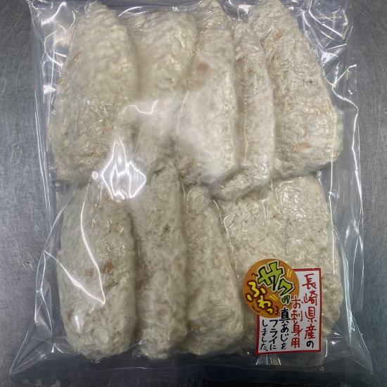 真アジ(長崎県産)、パン粉、コーンスターチ、コーン粉末、小麦粉、植物性たん白、粉末油脂、食塩/加工デンプン、増粘多糖類、乳化剤、イーストフード、膨張剤、調味料(アミノ酸)V.C、(一部に小麦・乳成分・大豆を含む)